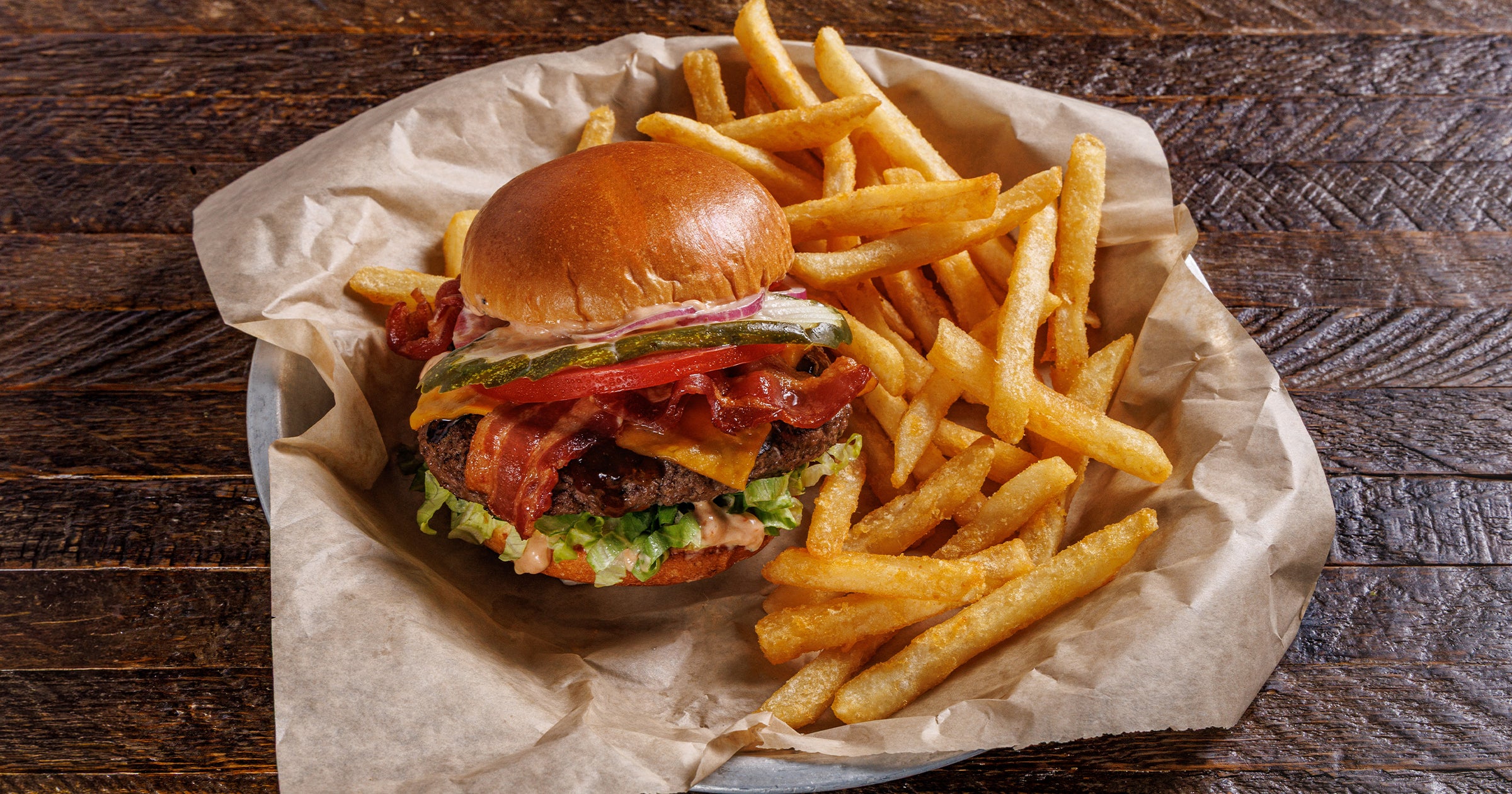 Grilled half-pound beef patty, smoked bacon, cheddar, chipotle ranch, lettuce, tomato, pickle, red onion. Choose from a side of fries, apple cider slaw, pickled cucumbers, or seasonal fruit, with the option to upgrade to Cajun fries, umami fries, lemon pepper tots, or onion rings for an additional cost.