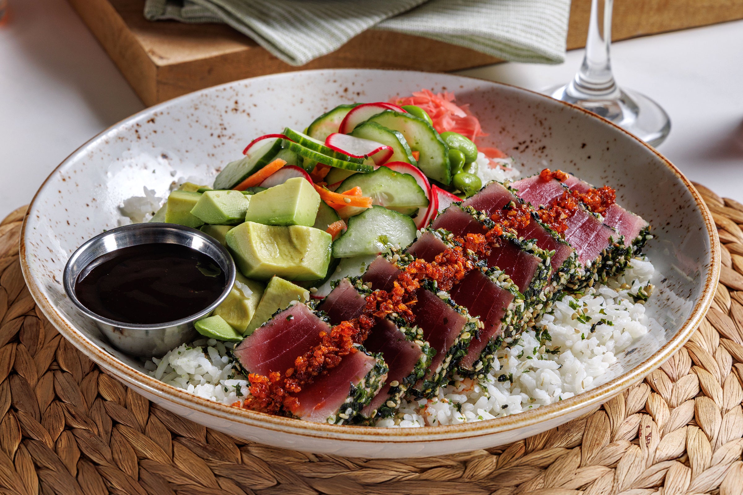 Sashimi grade seared rare tuna, furikake-seasoned rice, edamame, avocado, marinated cucumbers, pickled ginger, spicy garlic crunch, citrus soy dipping sauce