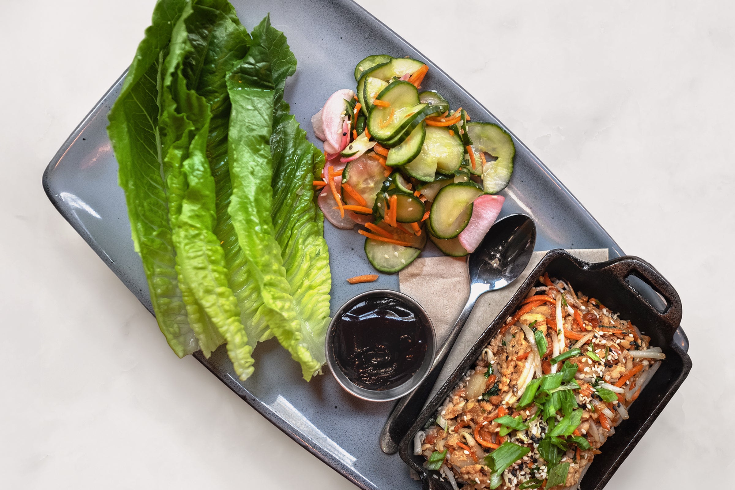 Ground chicken, ginger, garlic, water chestnuts, bean sprouts, peanuts, carrots, sesame soy sauce, with pickled cucumbers, hoisin and romaine lettuce