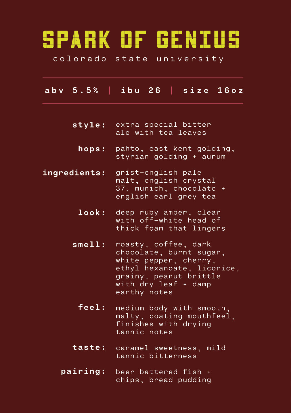 From the deepest, darkest-brew labs of Fort Collins, CO, comes our first mouthwatering beer discovery. We give you Spark of Genius, an electric ESB infused with the illustrious leaves of Earl Grey tea. This extra-special creation by Fermentation Science & Technology students at Colorado State University is sure to invigorate your taste buds with its caramel sweetness and mild bitterness.