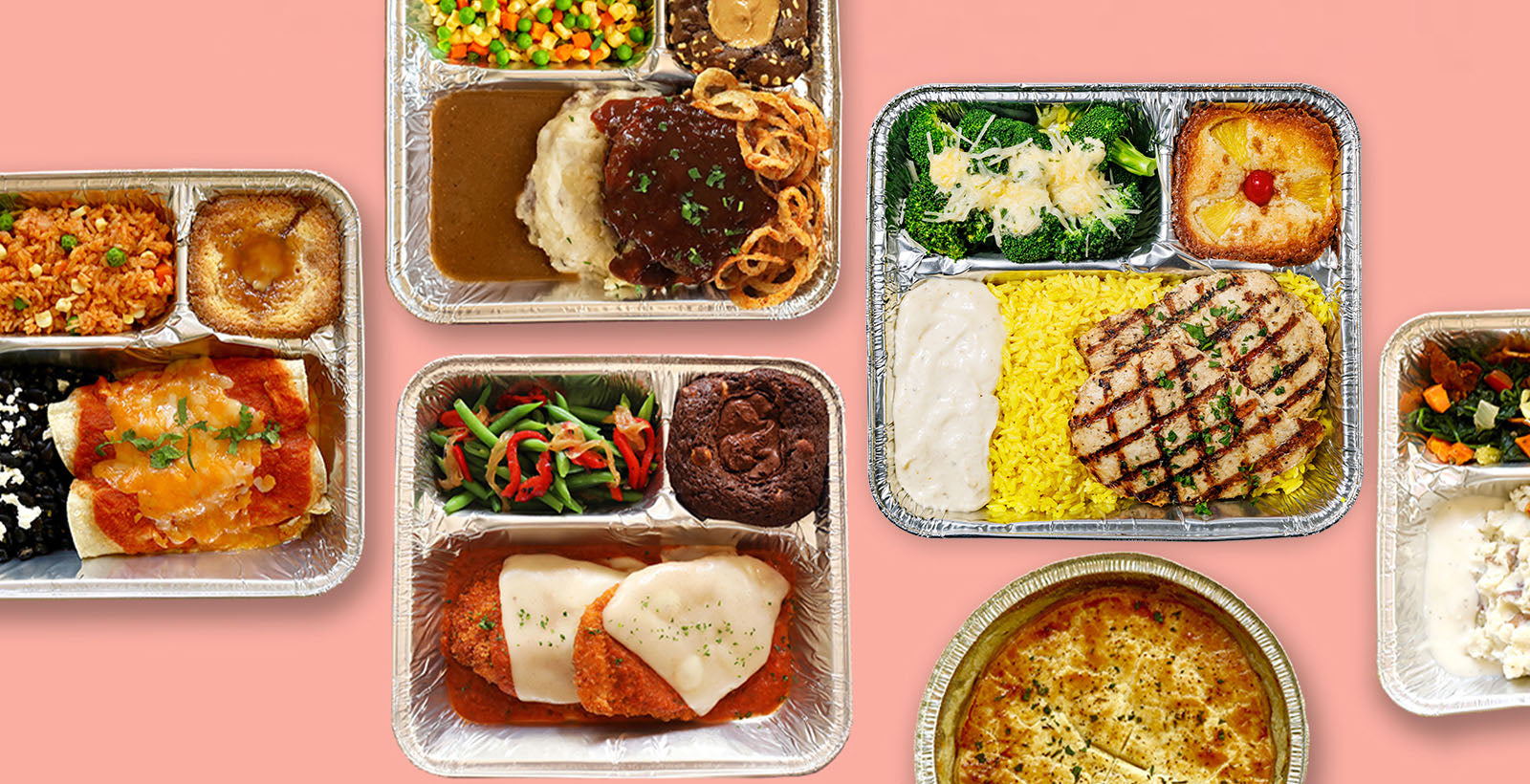 Our TV Dinners are just $10 each, and you'll get a filling and satisfying dish complete with an entrée, side and dessert. Some of our faves are the BBQ Meatloaf with brown gravy, red skin mashers, garlic butter corn, peas + carrots, and a peanut butter cup brownie; Chicken Parmesan topped with slow-cooked marinara and melted mozzarella, served with green beans, bell peppers + onions, and a Nutella brownie dessert; and Cheese Enchiladas topped with housemade chipotle ranchero sauce and cheese, served with Spanish rice and black beans, with a cinnamon churro caramel cake dessert.