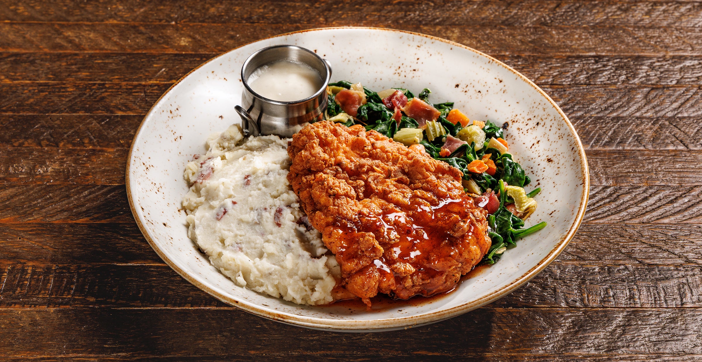 A hand-dipped buttermilk boneless chicken breast, red skin potato mash, white gravy, spiced maple syrup and sautéed spinach with smoked bacon.