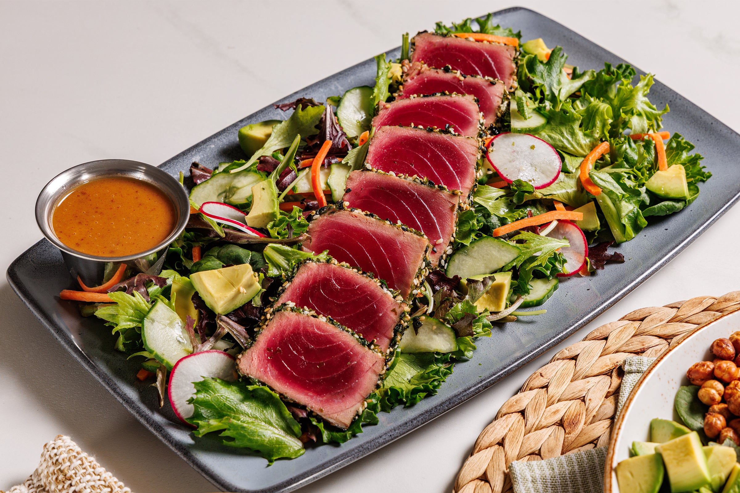 Line caught, seared-rare furikake-crusted yellowfin tuna, field greens, carrots, radish, avocado, pickled cucumbers, peanut ponzu vinaigrette + soy dipping sauce on the side