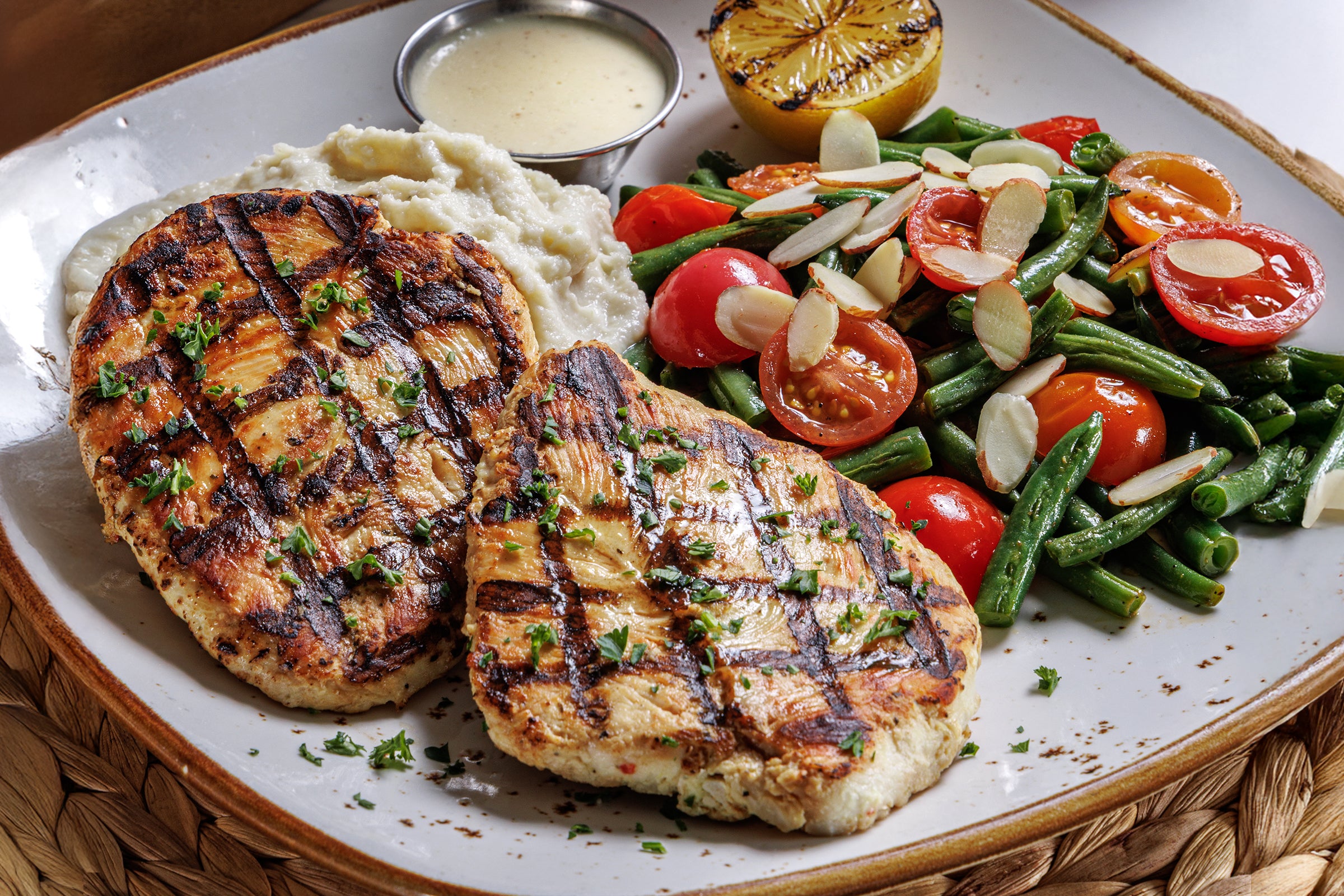 Grilled lemon chicken with cauliflower mash, green beans, tomatoes, sliced almonds and citrus cream