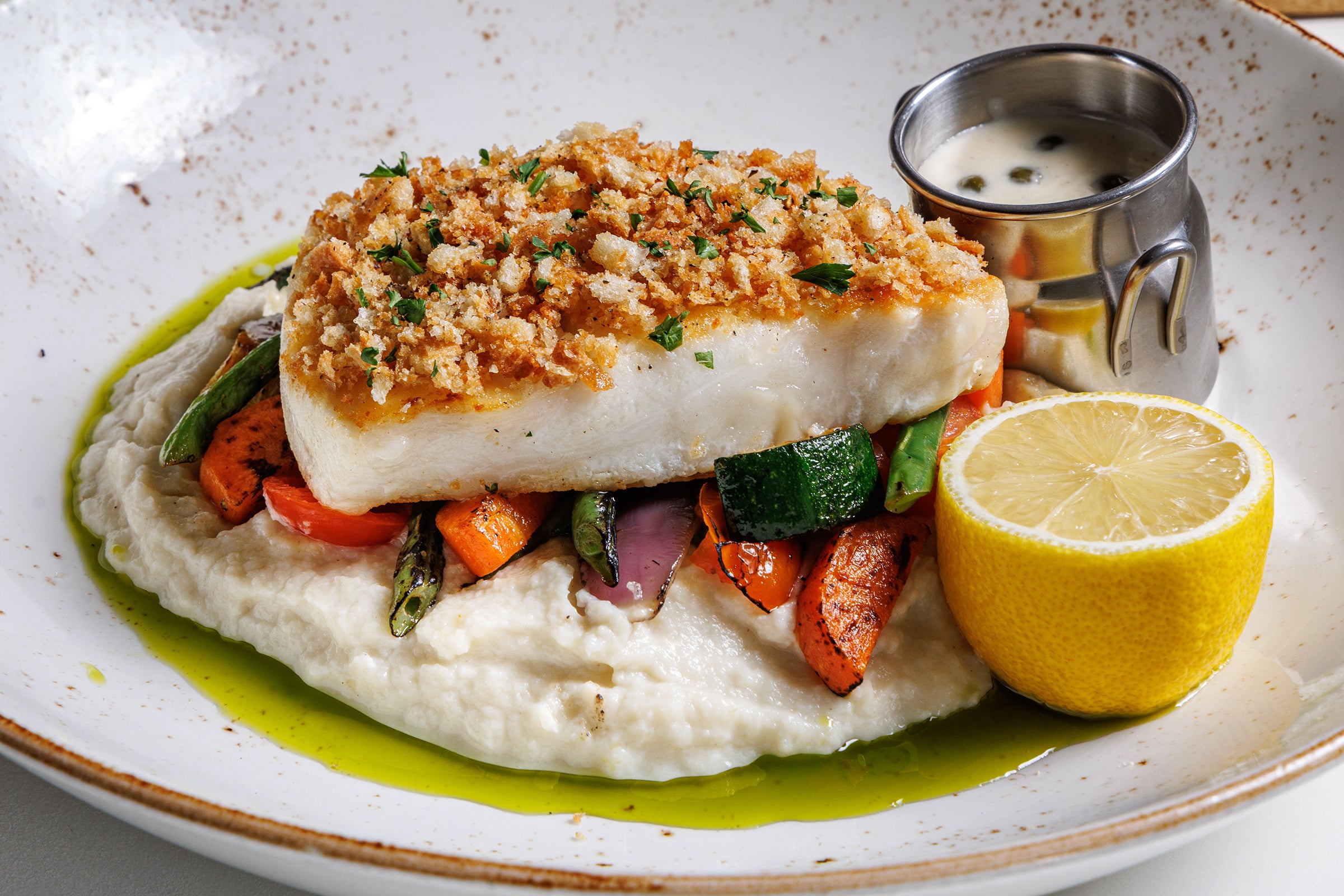 Pan-roasted sea bass, cauliflower mash, roasted veggies, garlic-herb crouton crackle, basil oil drizzle, lemon caper cream