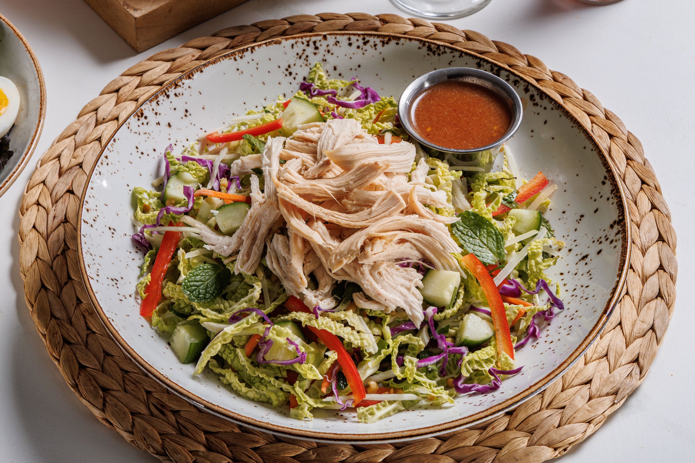 Chicken tossed with napa cabbage, mint, cilantro, carrots, peanuts, red bell peppers, cucumbers, spicy peanut vinaigrette