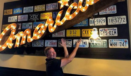 Jim had taken note of our American License Plate installation on the wall, an homage to the childhood game founder Chris Simms used to play with his brother, whereby someone earns points by spotting different license plates from different states.