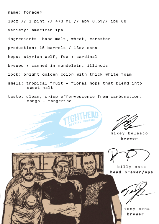 For the first Illinois release, it only made sense to collaborate with local brewer, Tighthead, out of Mundelein. These guys love experimenting and have cooked up a very special IPA. Introducing: Forager.