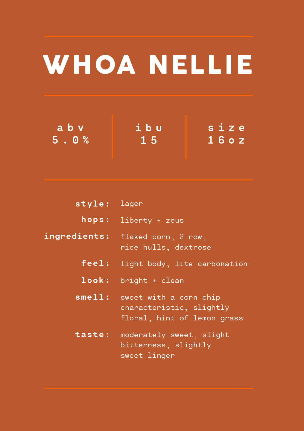 Next, we bring you a Mexican-style lager. Bright and clean, Whoa Nellie is brewed with flaked corn and lightly hopped, making it the perfect beer for those hot, dog days of summer.