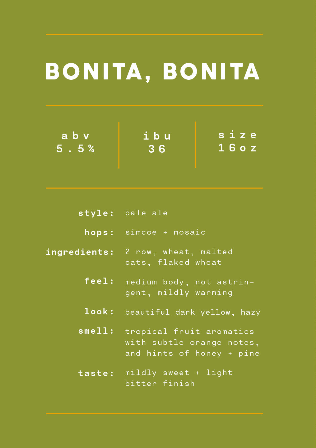 Last but not least, we bring you Bonita, Bonita – a mountain pale ale with hops that lend tropical fruit aromatics, subtle orange notes, and hints of honey and pine. This mouthwatering beautiful brew is all wrapped up in a mildly sweet and light bitter finish - so good, we say it twice.
