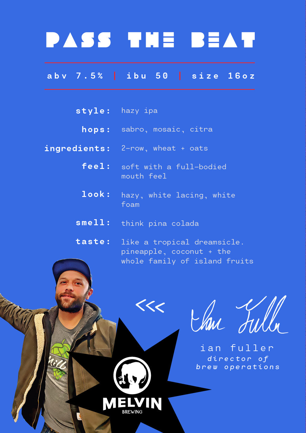 First up, we have Pass the Beat, a hazy IPA by our good friends at Melvin Brewing in Alpine, WY. They are known for their high-concept, high flavor beers, and they’ve created a full-bodied brew with refreshing notes of island fruit like pineapples and coconuts.