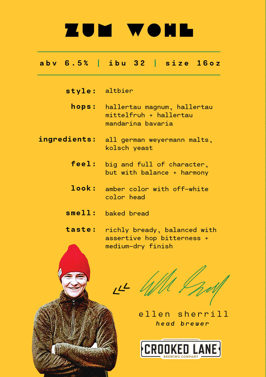 Next, we bring you Zum Wohl, an altbier brewed by Crooked Lane Brewing Co in Auburn, CA. We are so stoked to be working with a team committed to creating authentic beer styles, and this German-style brown ale doesn’t disappoint. All the hops used in this beer are grown in the Hallertau region of Germany which gives this brew a rich, bready taste that’s perfectly balanced with hops.