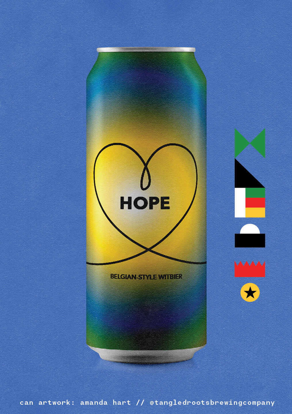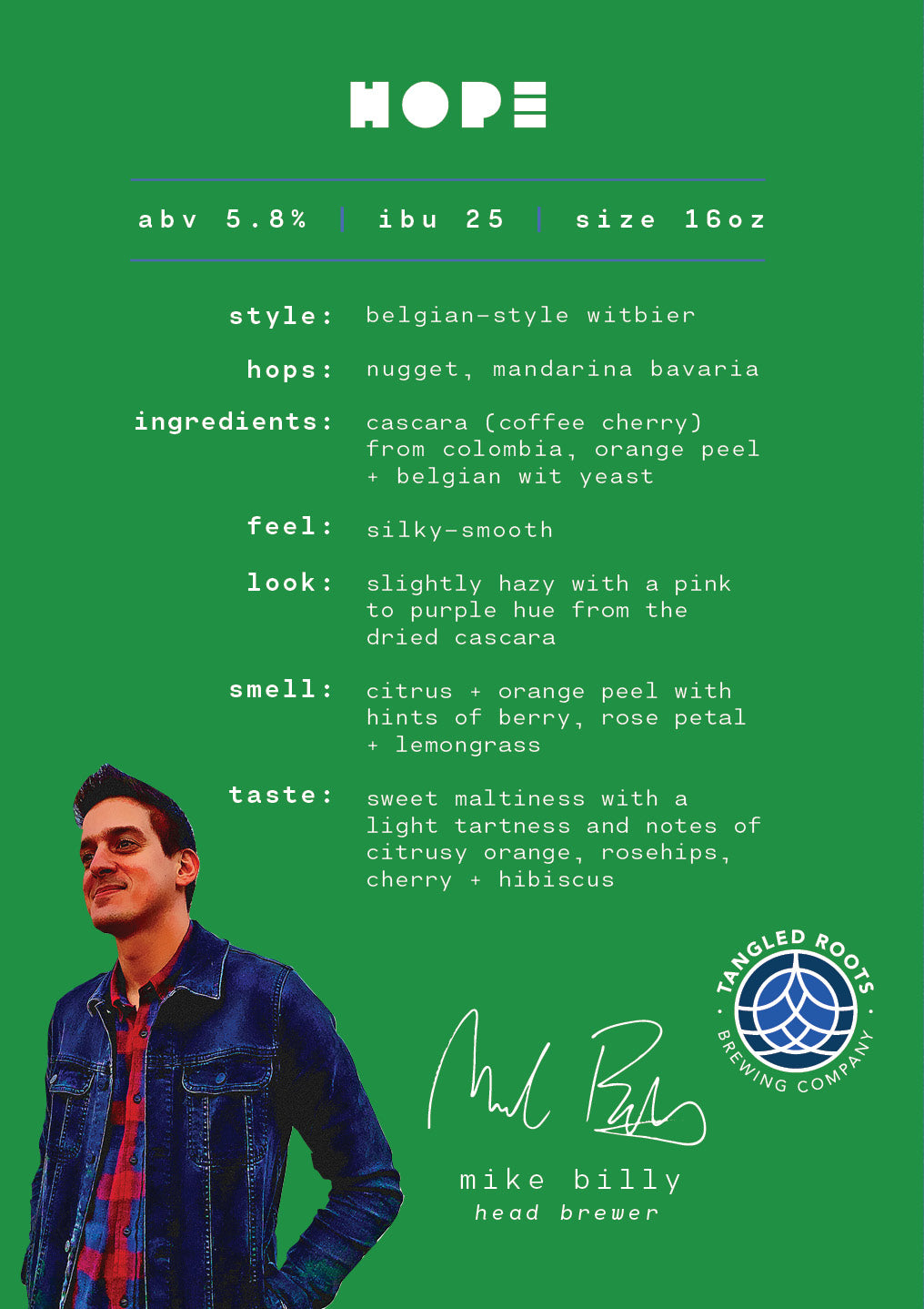 Our next beer is from Tangled Roots Brewing Company based in Ottawa, IL. They use traditional brewing processes while making beer for those with an adventurous palate! For this release, they've made a Belgian-style witbier called Hope, a crisp and citrusy beer with a pink to purple hue from dried cascara. Enjoy notes of citrusy orange, rosehips, cherry and hibiscus.