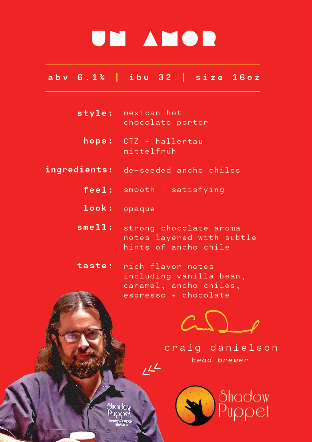 Last but not least, we bring you Un Amor – a Mexican hot chocolate porter made with de-seeded ancho chiles! One thing that we really dig about Shadow Puppet Brewing in Livermore, CA is that they use uncommon ingredients to design unique flavor profiles! This beer has strong chocolate aromatics with subtle hints of chiles, vanilla beans and espresso.