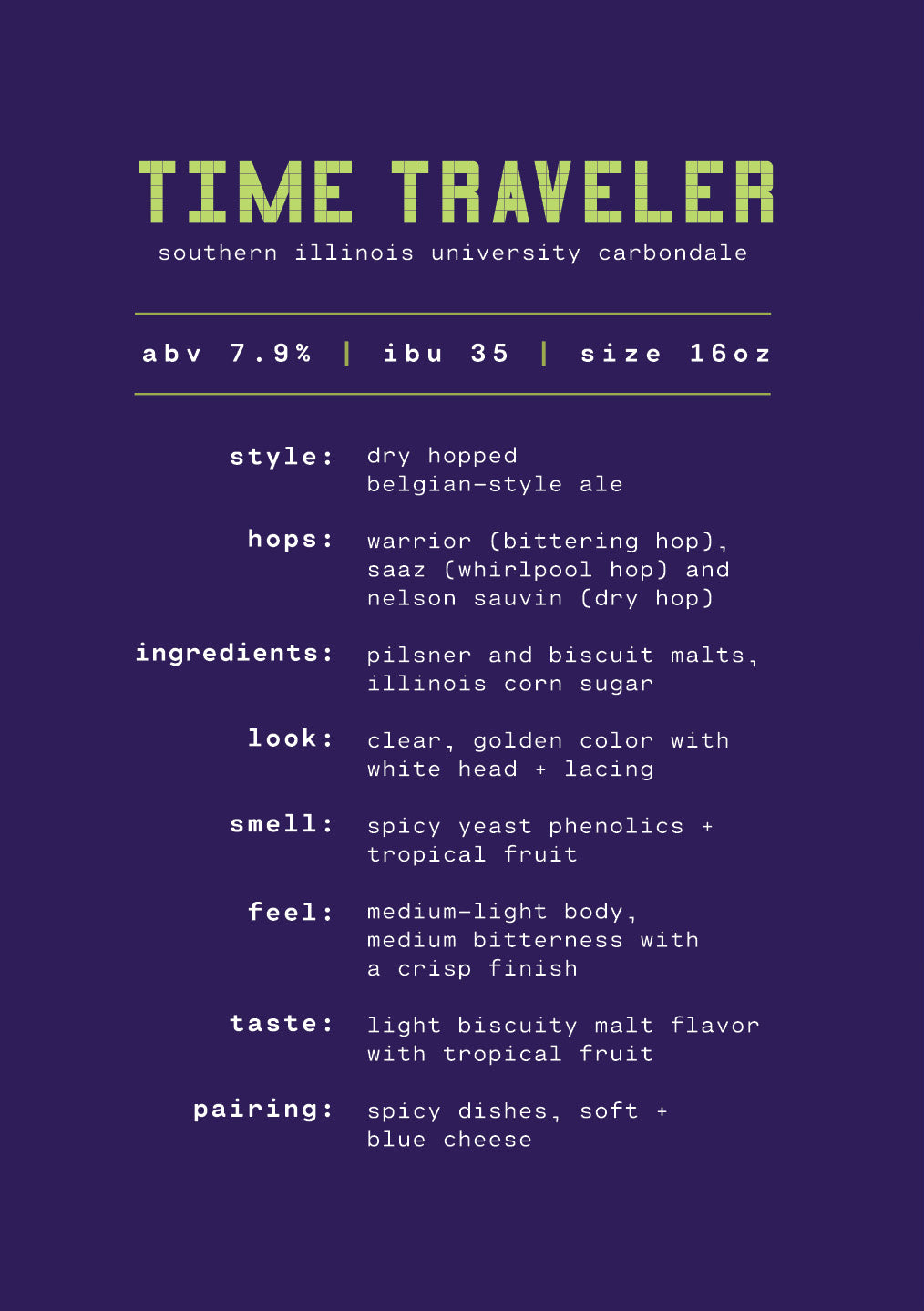 Last, but not least, the Fermentation Science Institute at Southern Illinois University in Carbondale, IL, has made history! These brilliant brewers of tomorrow have tinkered with time, pairing medieval Belgian super yeasts from the 5th century with New Zealand Nelson Sauvin hops from the 21st century to bring you Time Traveler, a dry-hopped Belgian Ale. This Old-World Belgian style definitely tastes New Age.