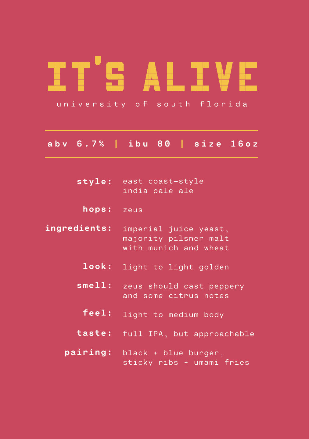 Our third brew in this release … is … It’s ALIVE! This electrifying brainchild from the brewing arts lab at the University of South Florida in St. Petersburg, FL, is sure to turn heads and awaken taste buds wherever it goes. What we have is a truly exhilarating East Coast IPA with peppery-citrus notes, thanks to the use of a single hop: the almighty Zeus hop. This medium-bodied brew lab masterpiece is one you won’t be able to ignore.