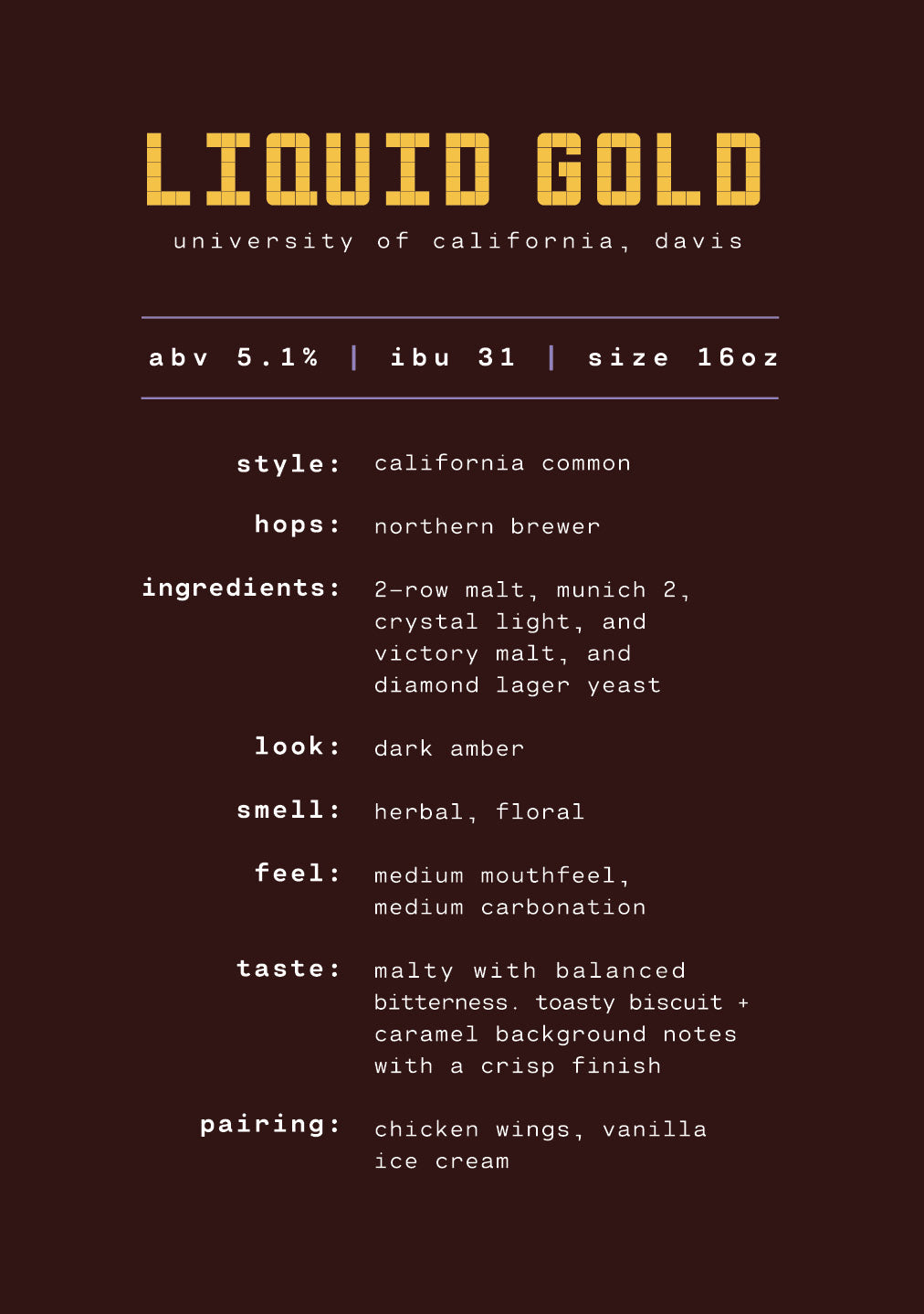 Up next? The way we see it, the brewing program at UC Davis has struck gold! Liquid Gold, to be exact. This California Common is a magnificent malty discovery, amber-colored to the naked eye with herbaceous-floral notes. There is obviously nothing common about this brew. A hybrid beer experiment, brewed like an ale but with lager yeast, this recipe is as innovative and unique as these budding brewers from Davis, CA.