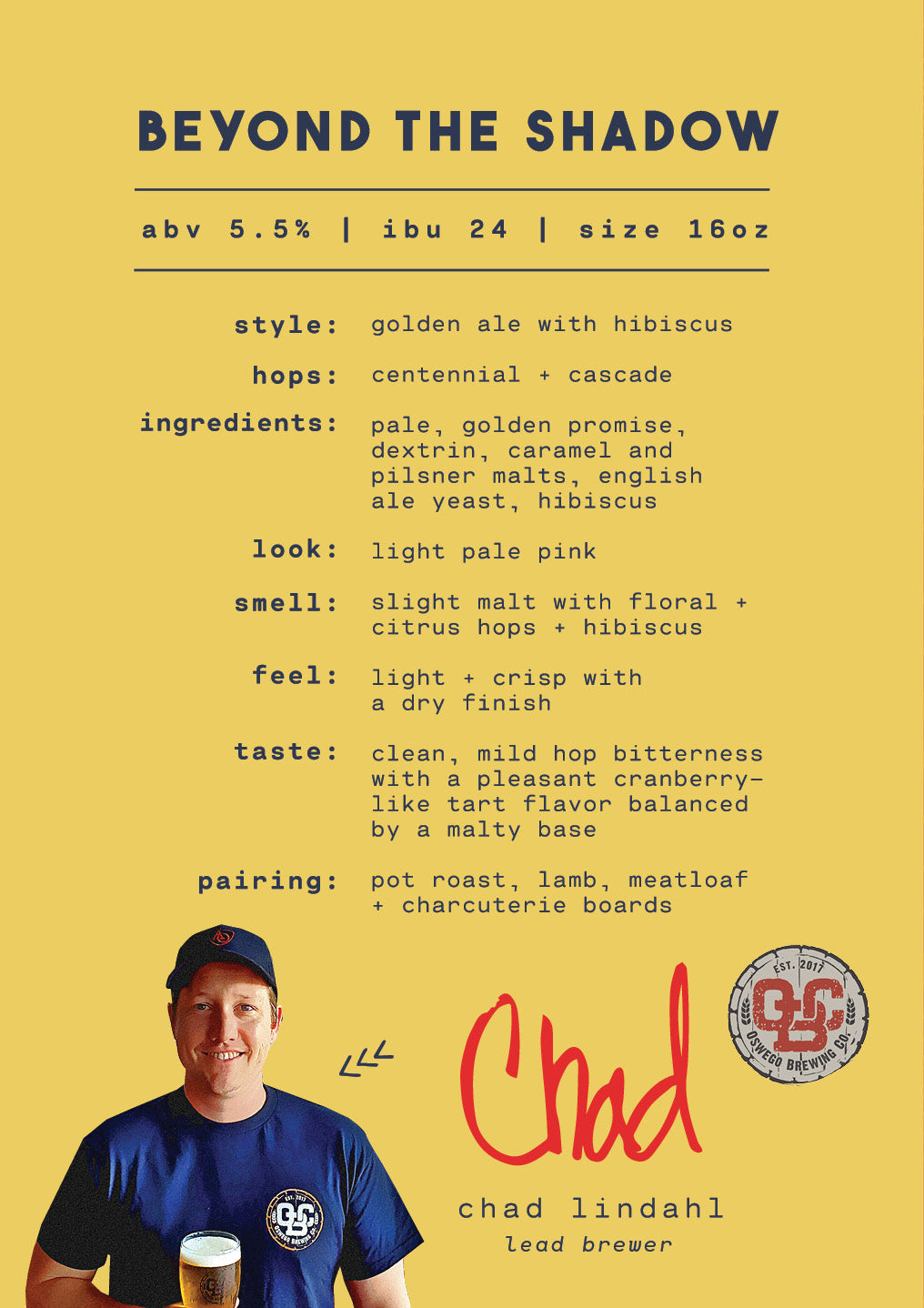 You never know what you’ll find Beyond the Shadow. Perhaps a mysterious shelled creature with long spiraled tentacles propelling it forward? Or maybe a golden ale with hibiscus from our friends at Oswego Brewing Co. in Oswego, IL. This unique, pink-tinted brew is approachable, flavorful and refreshing.