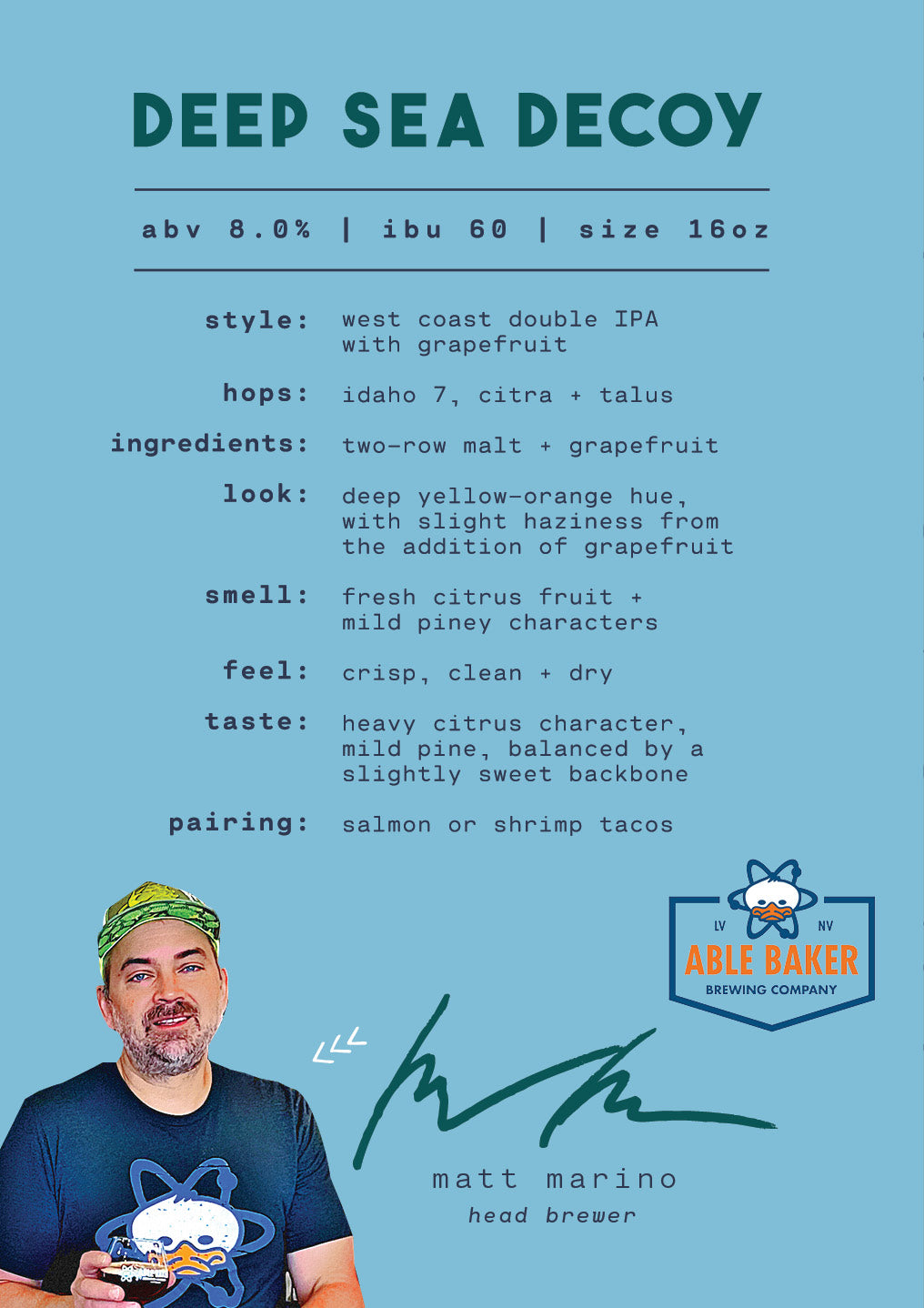 A glimmering light stands out in the darkness and lures you in, but beware of the Deep Sea Decoy. That luminous beacon may instead lead you straight to the sharp fangs of this predator. Encounter this citrus-forward West Coast double IPA brewed by Able Baker Brewing Co. in Las Vegas, NV, with a delicious dose of grapefruit.