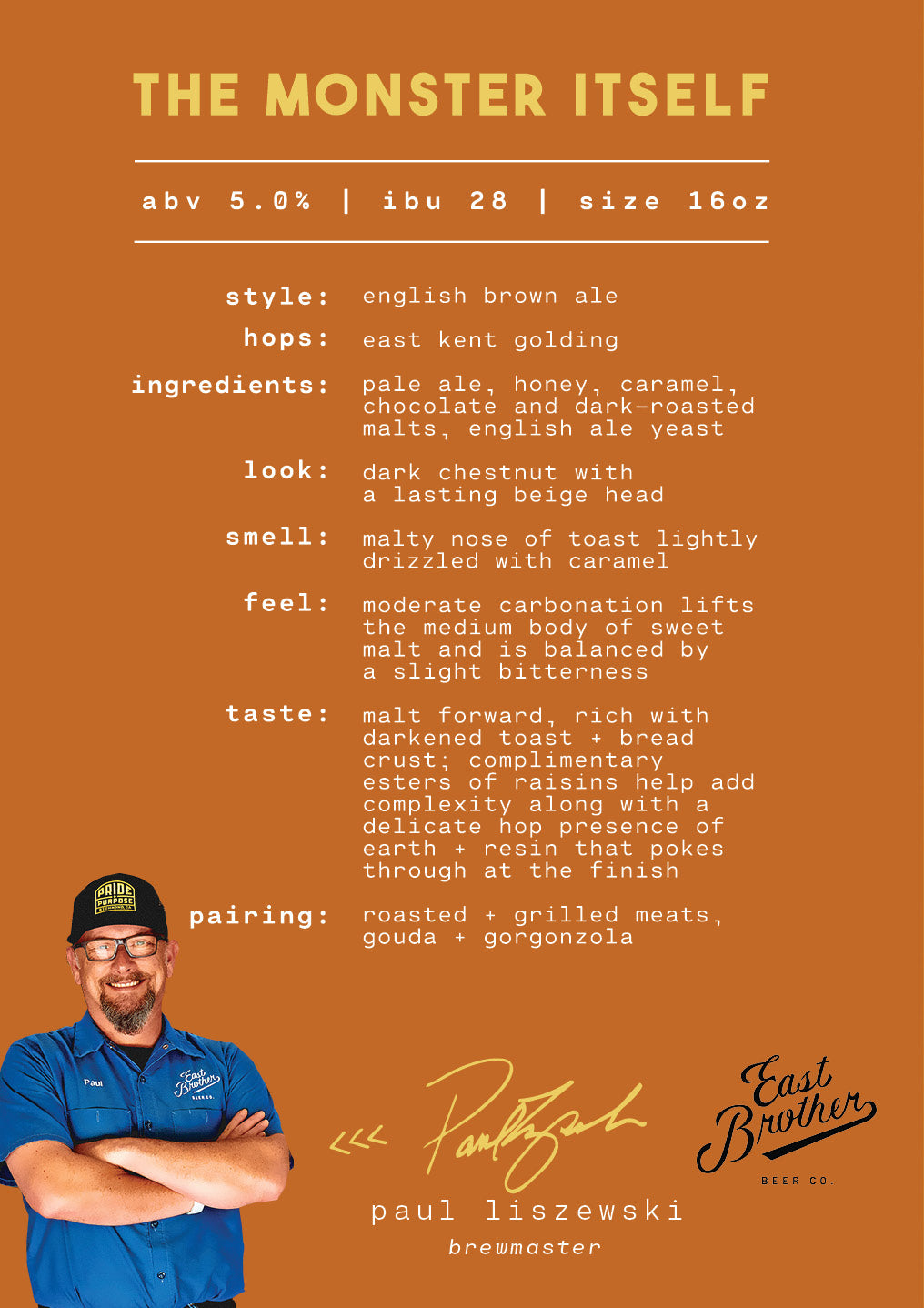 Neither squid nor octopus, Vampyroteuthis infernalis, aka the vampire squid, is one of the most enigmatic creatures of the deep. Come face-to-face with The Monster Itself, from East Brother Beer Co. in Richmond, CA. This English brown ale with a creamy mouthfeel has a malty nose of toast drizzled with caramel.