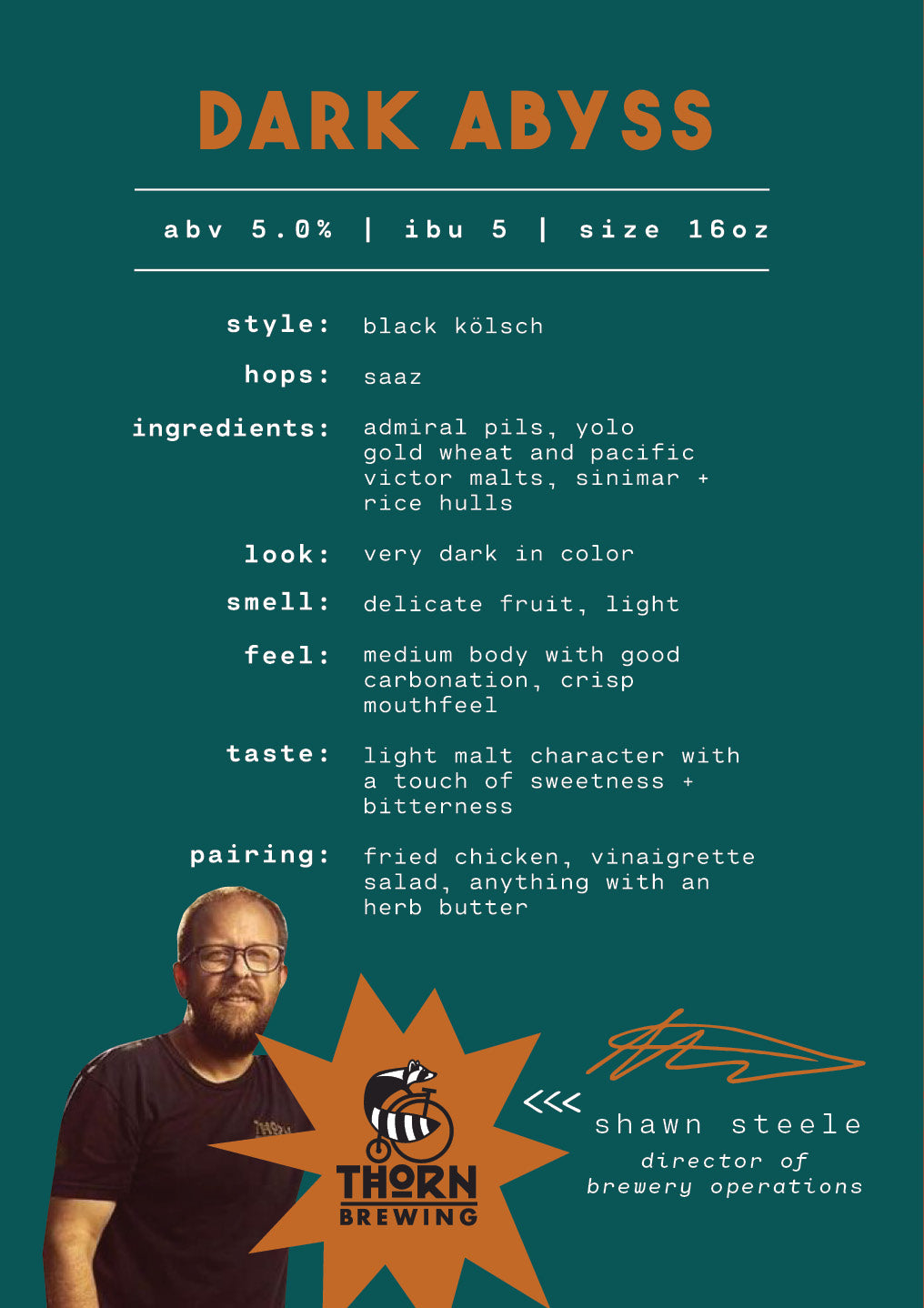 Few creatures can live in this unknown part of the sea, but the comb jelly has thrived for millions of years. Meet Dark Abyss, a black kölsch from Thorn Brewing Co. in San Diego, CA. Dive into this ale, which is as dark as the deepest parts of the sea but features a light malt character with a touch of sweetness and bitterness.