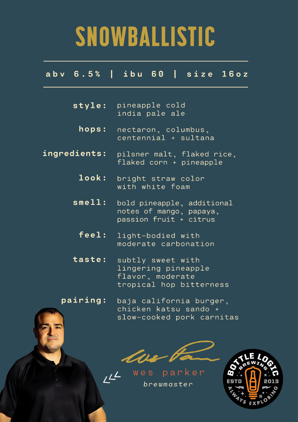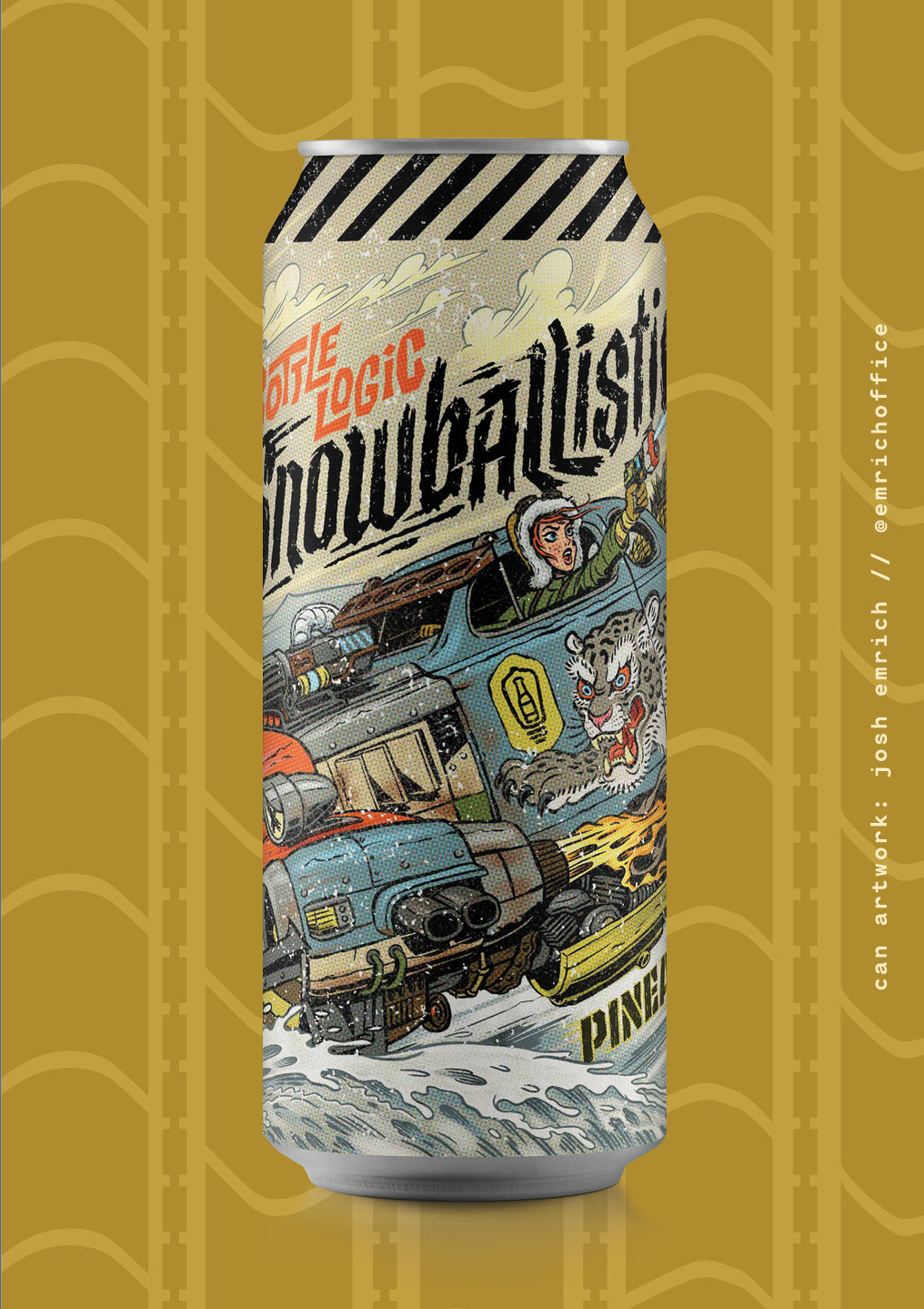 First on scene is Snowballistic, a resilient snowplow rig, dead set on defending its precious pineapple cargo. This pineapple cold IPA from Bottle Logic Brewing in Anaheim, CA, is brewed with lager yeast at colder temps for an unexpected twist on the traditional IPA.