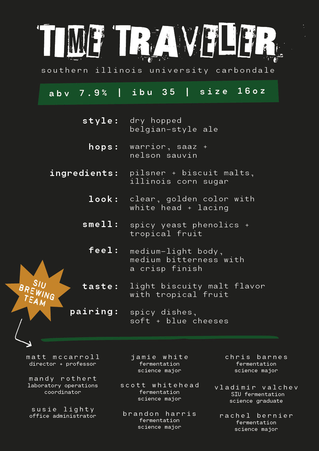 Last, but not least, we have Time Traveler, a mind-bending Belgian-style ale crafted by the future rockstar brewers at the SIU Fermentation Science Institute in Carbondale, IL. They've shredded though time, merging medieval Belgian super yeasts with modern New Zealand Nelson Sauvin hops to create a brew that will take your taste buds ona stage dive into a whole new dimension.