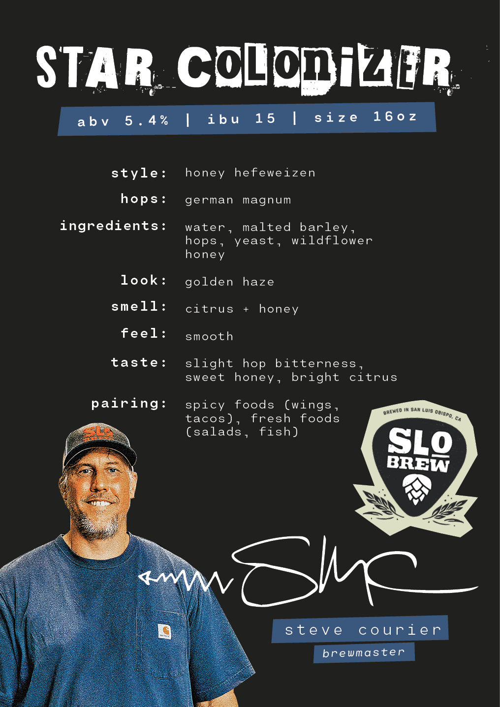 Give it up for Star Colonizer, presented by SLO Brew in San Luis Obispo, CA. This soft-bodied hefeweizen features riffs of banana, clove and West Coast hop bitterness. Bold hops perfectly harmonize with fresh wildflower honey, creating a brew that's sure to make your senses dance with delight.