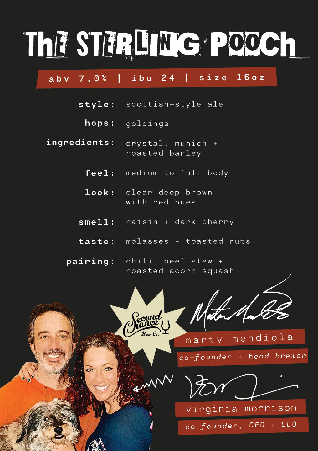 Next, get ready to mosh! It's The Sterling Pooch – a punk rock superhero Scotty dog who fearlessly jumps into action. We bring you this edgy Scottish-style ale by the crew at Second Chance Beer Co. from San Diego, CA. With exhilarating hints of molasses, raisins and dark cherries, this ale is a head-banging, tail-wagging treat.