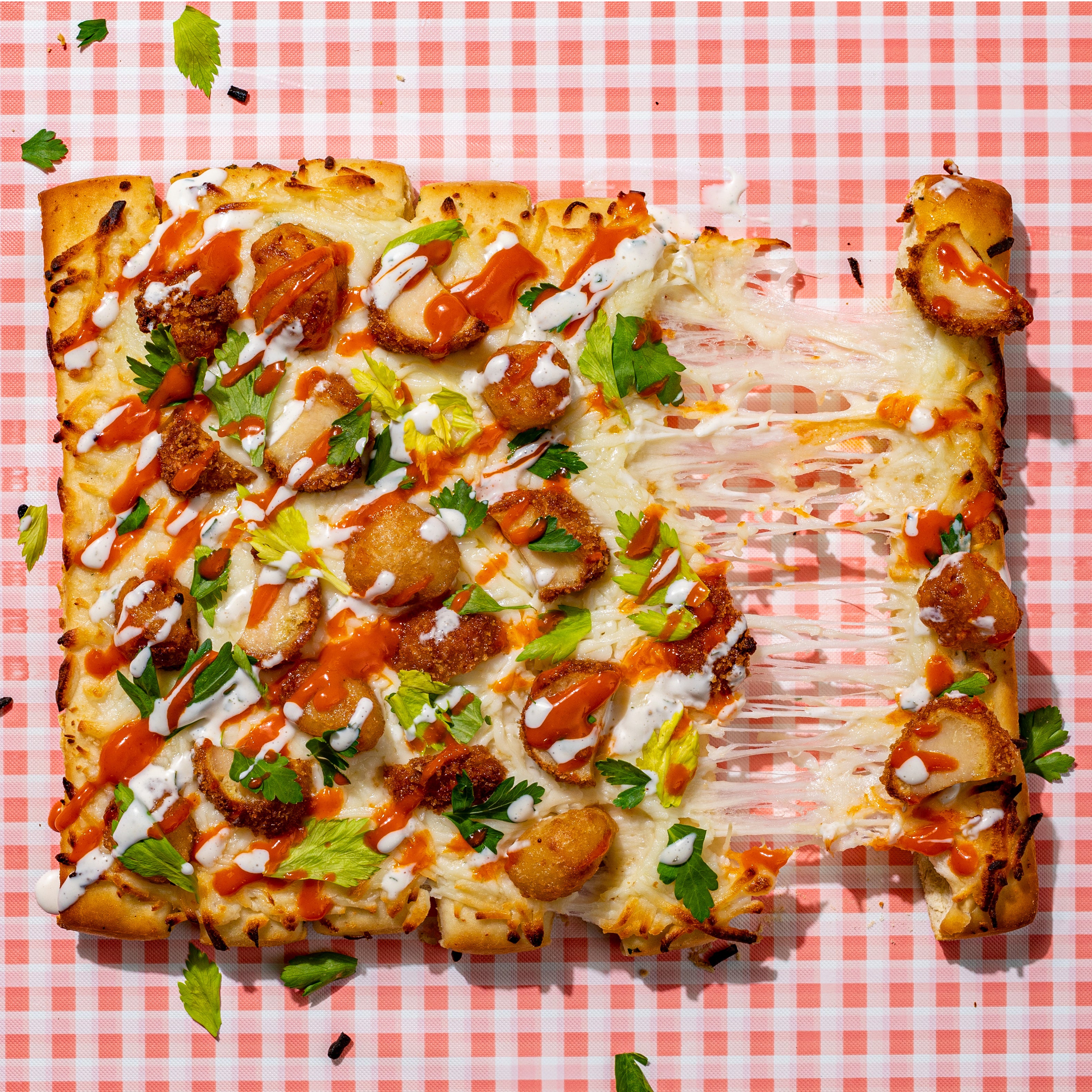 mozzarella, cheddar cheese curds, fried chicken, buffalo sauce, garlic, buttermilk ranch, celery leaf, parsley