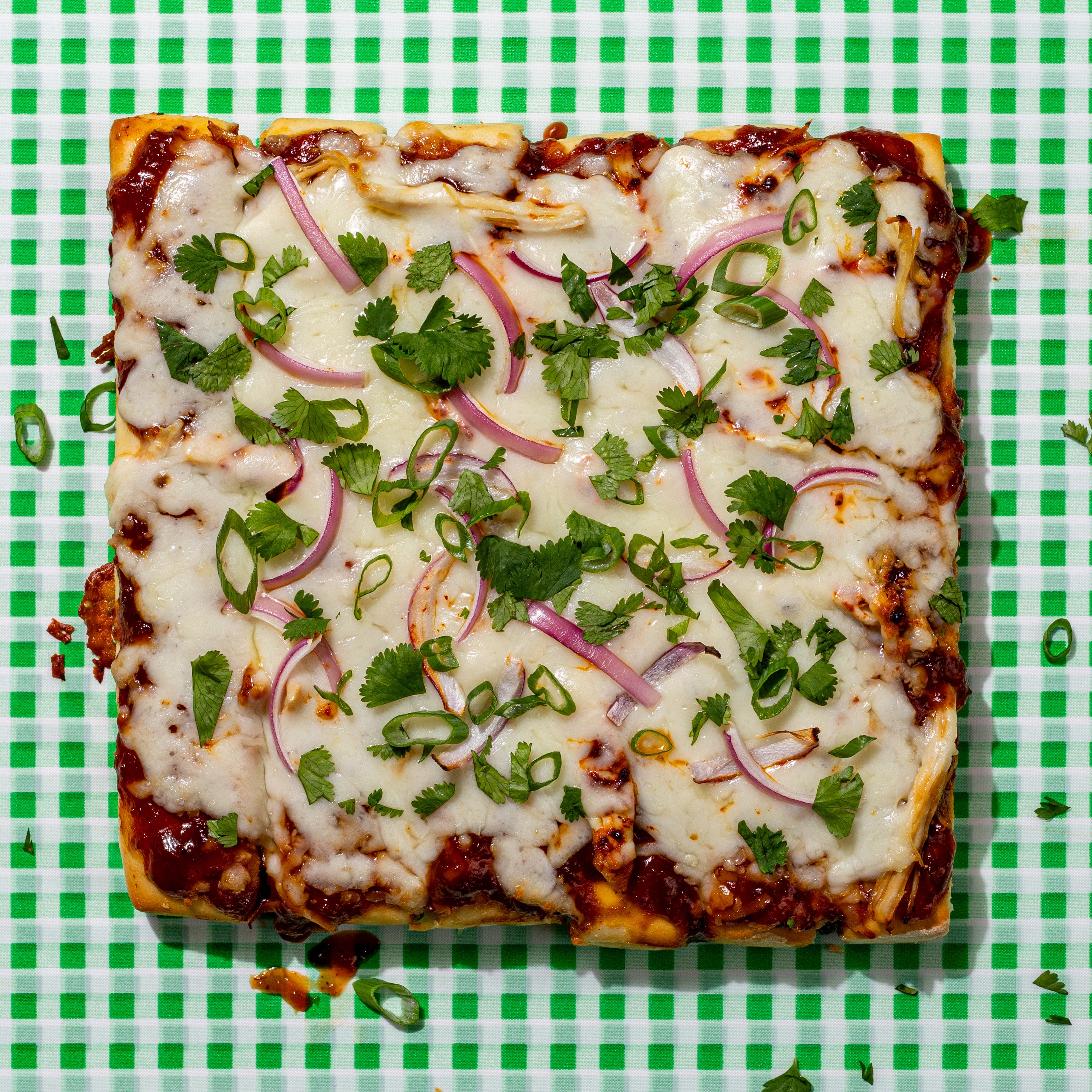 smokey BBQ sauce, mozzarella, hand-pulled chicken breast, garlic, red onion, cilantro, green onion