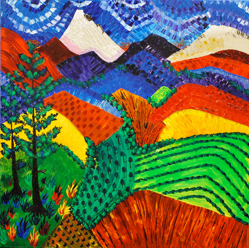 “Most of my paintings are perfected in the early morning hours with a cup of coffee in one hand and a paintbrush in the other,” Karla said. “The pre-dawn hours, before the office opens, is my creative time.” It was during one of these mornings while looking out her studio window that Karla got inspiration for her piece Mt. Hood & Douglas Fir. “I looked out my studio window and saw that our cover crop had been mowed the night before into a mesmerizing pattern of perfectly sculpted rows of cut hay,” she said. “This beautiful green field needed to be captured on canvas.”
