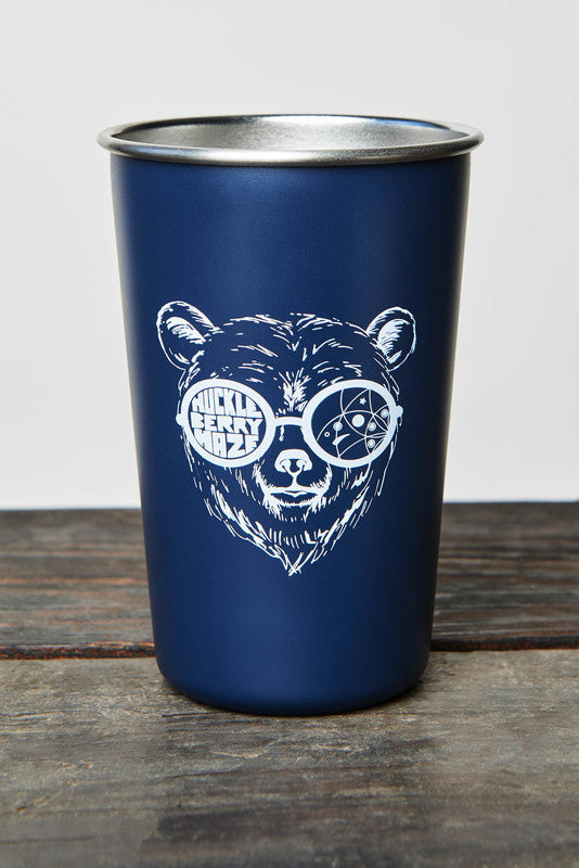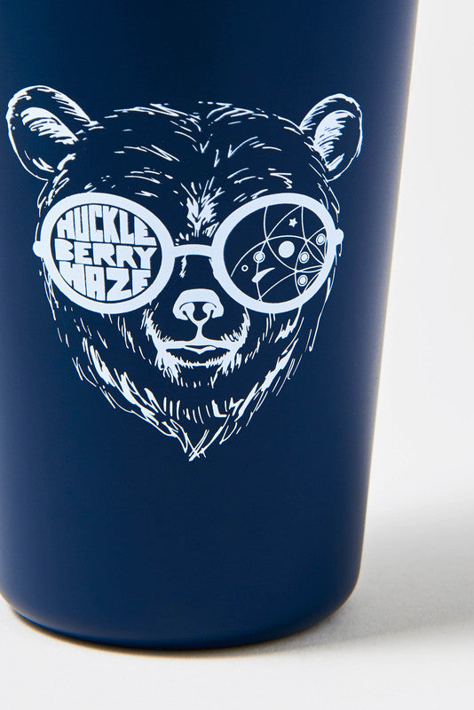 A reusable 100% stainless-steel 16oz tumbler perfect for at-home use or brews around the campfire, featuring our Huckleberry Haze IPA bear.